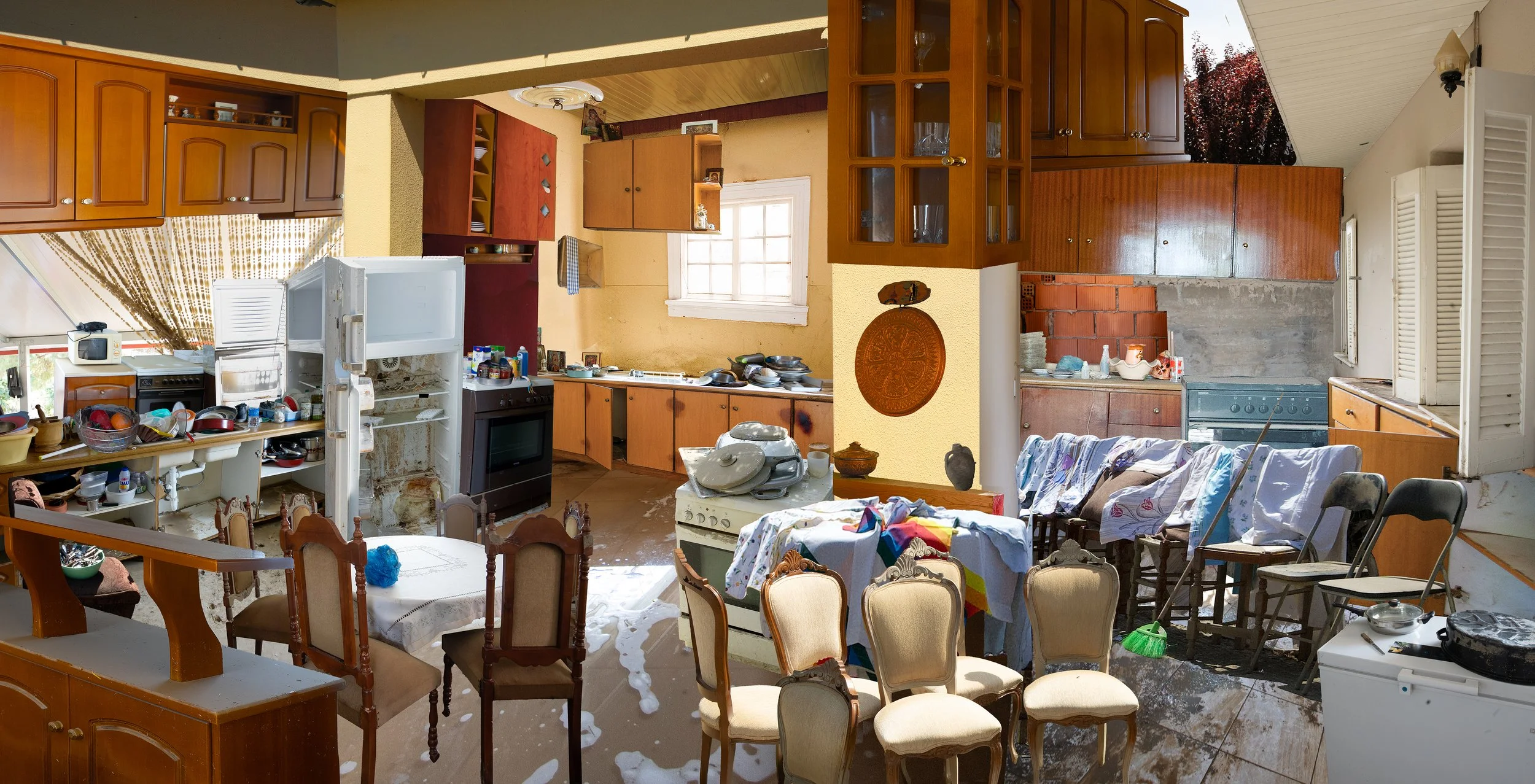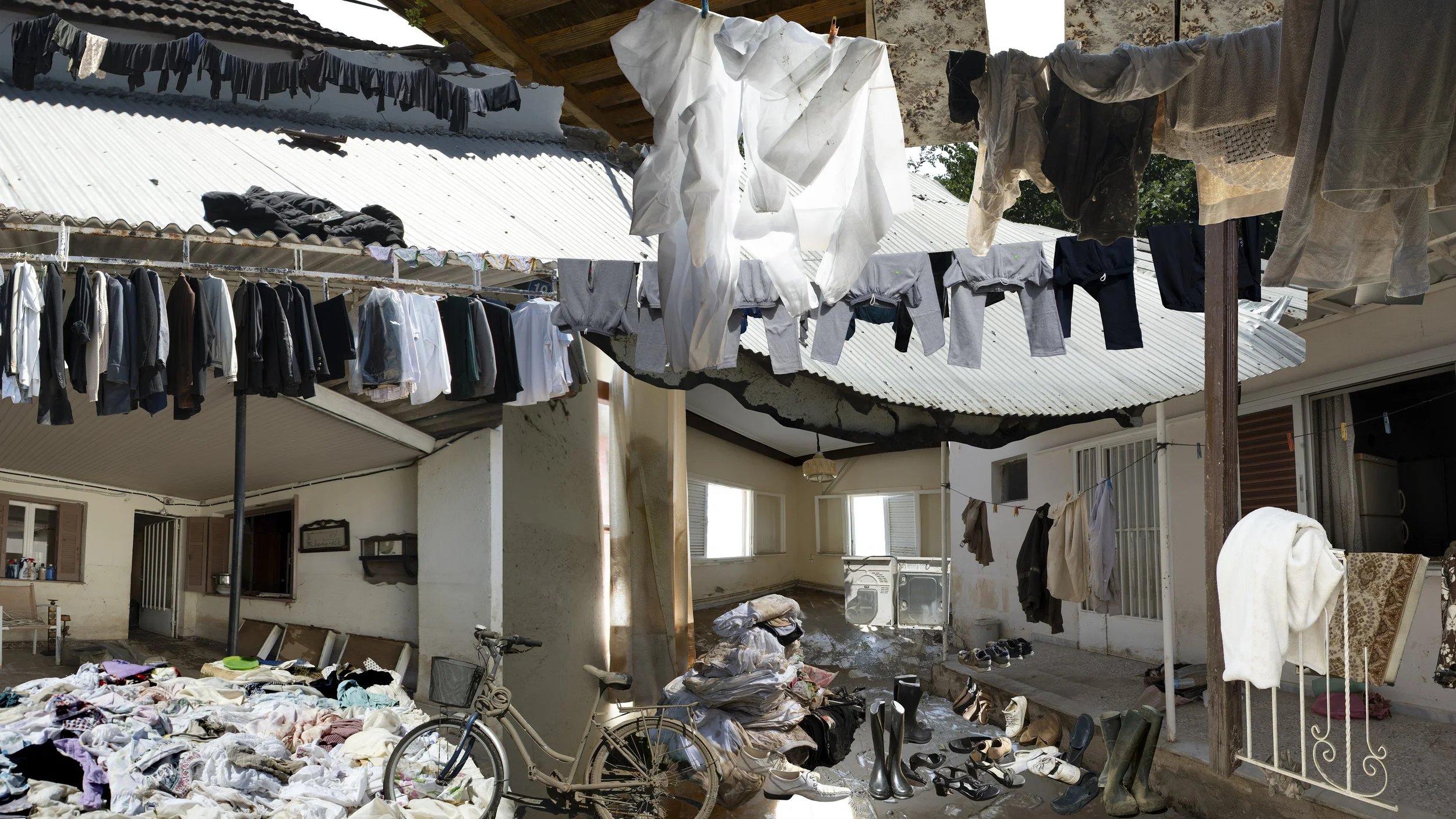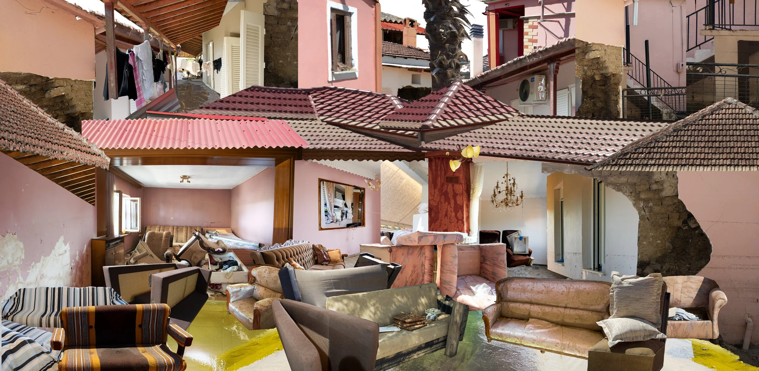 Palamas Reframed is a photographic series by Violetta Lorentzou, constructed from documentation of flooded homes in Palamas, Greece, after Storm Daniel in September 2023. The storm submerged the town and much of the Thessaly region, resulting in Greece’s most costly recorded environmental disaster. When the water receded, domestic interiors were abruptly displaced into public space: mattresses, cupboards, children’s desks, appliances, and personal photographs lay exposed in the streets. These involuntarily revealed fragments form the basis of the work.